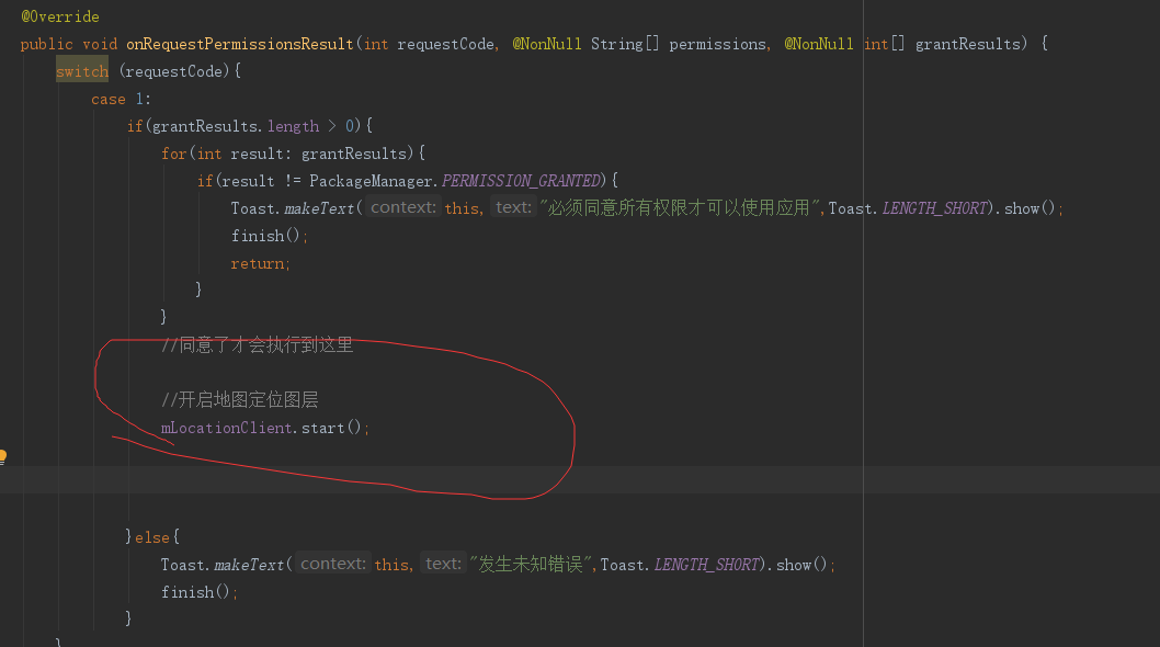 Toast.makeText(this,"必须同意所有权限才可以使用应用",Toast.LENGTH_SHORT).show();