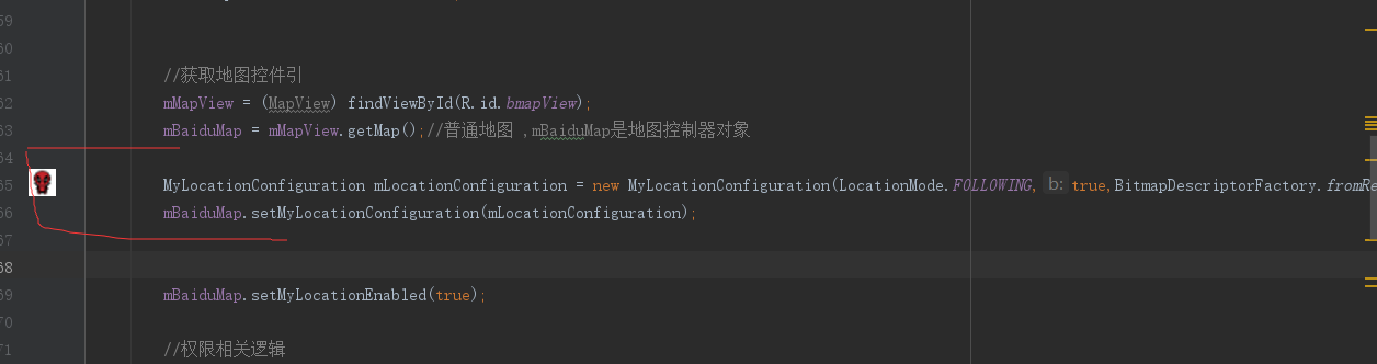 MyLocationConfiguration mLocationConfiguration = new MyLocationConfiguration(LocationMode.FOLLOWING,true,BitmapDescriptorFactory.fromResource(R.drawable.dead));