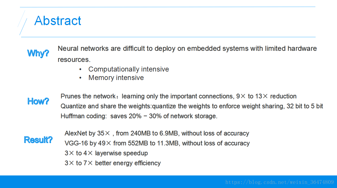Weight Shared and Quantization(权值共享和量化):权值共享就是多个神经元见的连接采用同一个权值,权值量化就是用更少的比特数来表示一个权值;