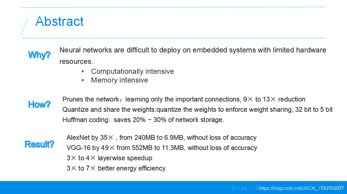 模型压缩一直是机器学习的一个重要方向,并且一个模型不可能只在GPU和服务器上运行才可以。只有通过硬件化实现才能落地。但是神经网络也是非常耗费存储和耗费运算的。LeNet-5是一个简单的手写数字识别网络,AlexNet和VGG-16则用于图像分类,刷新了ImageNet竞赛的成绩,但是就其模型尺寸来说,根本无法移植到手机端App或嵌入式芯片当中,就算是想通过网络传输,较高的带宽占用率也让很多用户望尘莫及。另一方面,大尺寸的模型也对设备功耗和运行速度带来了巨大的挑战。随着深度学习的不断普及和caffe,tensorflow,torch等框架的成熟,促使越来越多的学者不用过多地去花费时间在代码开发上,而是可以毫无顾及地不断设计加深网络,不断扩充数据,不断刷新模型精度和尺寸,但这样的模型距离实用却仍是望其项背。本文希望通过一些方法把原本耗费大量存储和运算的神经网络实现在硬件上。