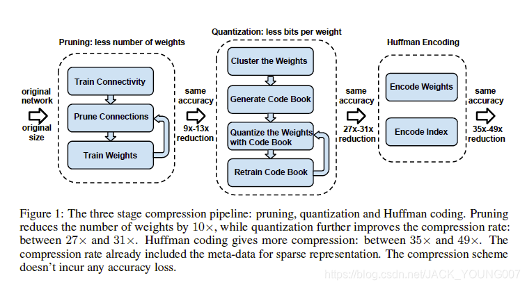 首先,网络通过正常的训练,训练出相应的权重,然后把低于某个阈值的权重删除掉,然后再训练模型,一次次去掉冗余的链接;然后网络把保留的权重进行聚类和权值共享,然后通过训练不断调整聚类的中心点和聚类的数量,然后将最后的权值和权值索引进行哈夫曼编码,达到模型压缩的效果。
