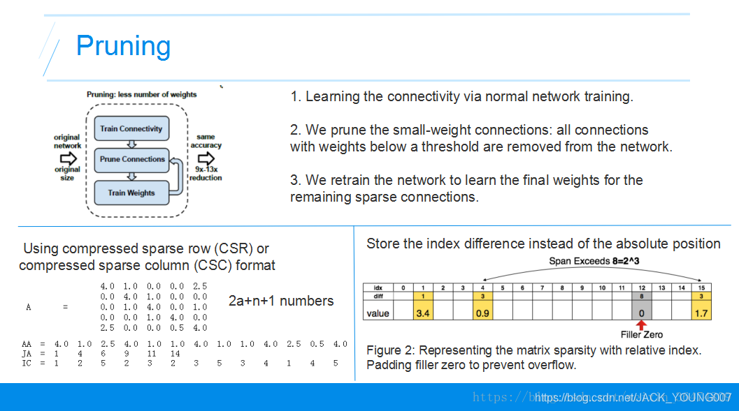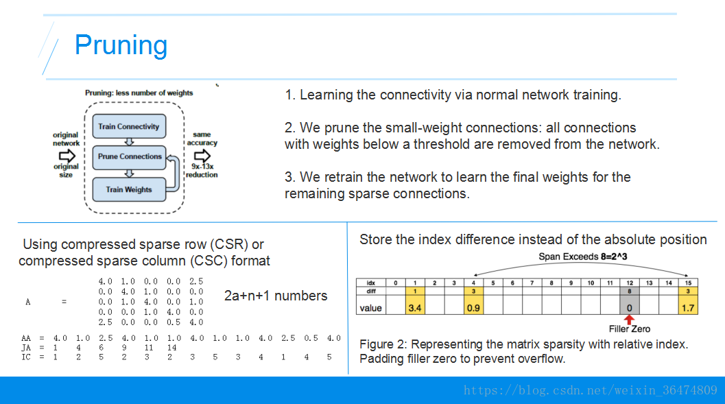 稀疏矩阵的存储:经过权值修剪后的稀疏网络,就可以用一种紧凑的存储方式CSC或CSR(compressed sparse column or compressed sparse row)来表示。