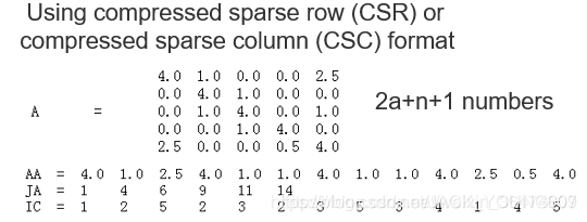 第二行JA存储所有系数矩阵中每行第一个非零元素在AA的位置,例如第一个元素是4.0,在AA中位置是第一个,第二行第一个元素是4.0,在AA中位置是第四个。通过JA可以将AA中所有元素对应的行恢复出来。