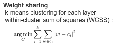 - 压缩后分母:n为权重的个数,log2(k)表示聚类后的每一类的比特数。用这个可以恢复出共享的每一个权值属于哪一类,k为聚类数,b为之前的需要存储的精度,用这个可以恢复出每一个聚类的中心点的位置。