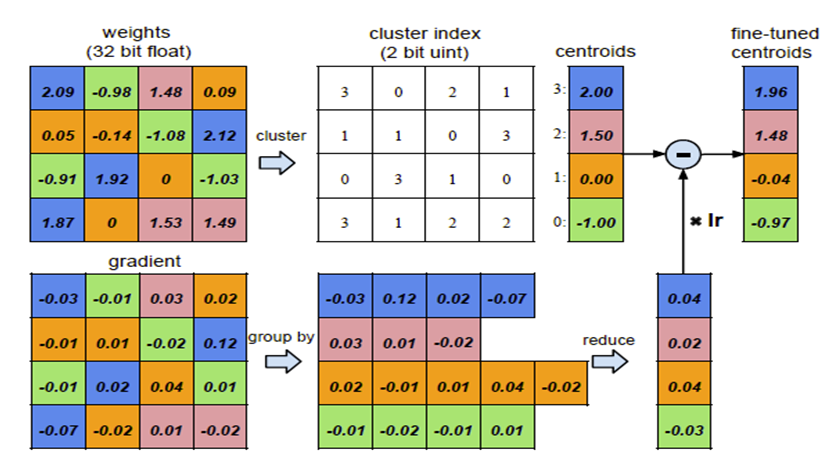聚类方法:运用K-means的聚类方法,将权值接近的共享。运用聚类中心点的值作为所有权值的值。例如上面相同颜色的就是同一个聚类的。