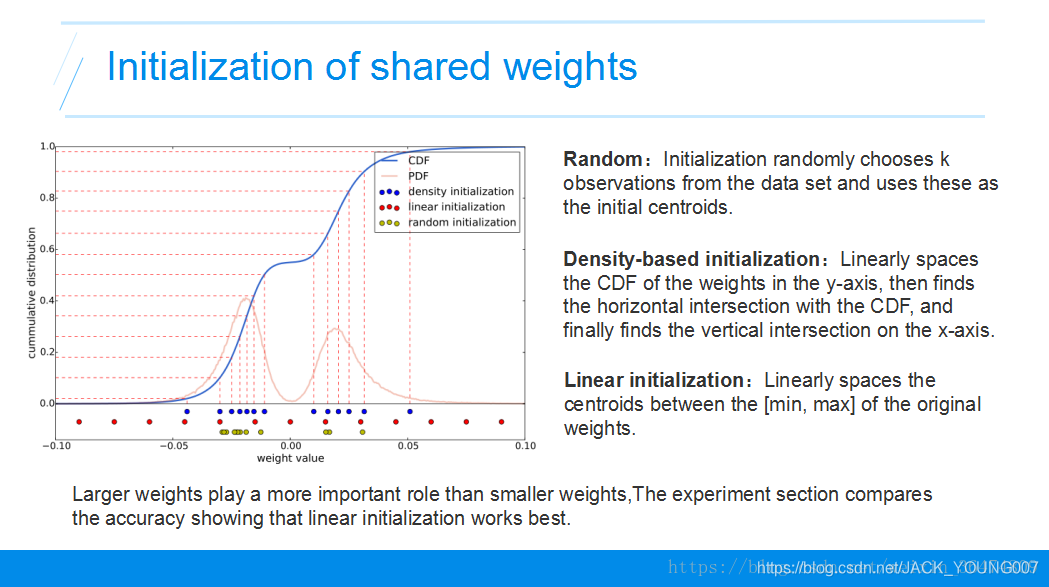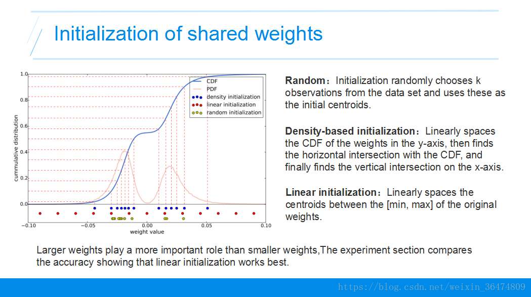权值共享的是聚类中心点的位置,初始的聚类中心点是如何确定的呢?有三种方法可以确定聚类中心点的位置。一是随机的方法,就是在权值中随机的选k个值做为聚类中心点。还有一种是基于密度的初始化,我们可以看这个图,横轴是对应的权值的值,纵轴是权值的数量,类似于直方图一样。红色的线是权值的直方图统计,蓝色的线是权值的累积统计,类似于概率密度函数和概率累积函数。基于密度的初始化就是把权值从小到大等分成k份,然后每一份分界点的权值就是聚类的中心。线性的初始化就是直接把最小值最大值之间直接线性进行划分。