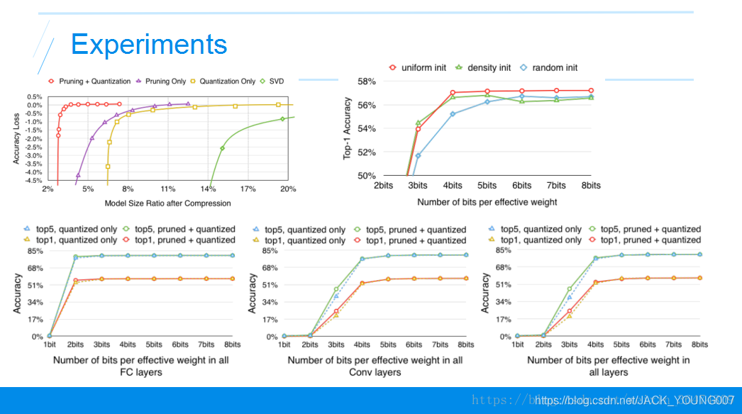 首先第一个实验,不同压缩方法在不同压缩率下精度的损失。横轴是压缩率,越靠左压缩率越大,纵轴是精度的损失,就是压缩之前和压缩之后的准确率的减少的量。这条曲线越靠左上越好,表明更大压缩率下精度损失更少,我们看到最好的方法就是剪枝和权值共享和权值量化的方法。