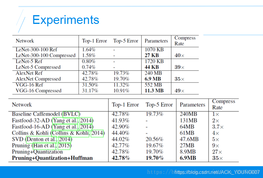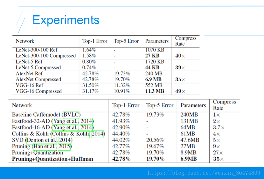相应的实验,AlexNet压缩了35倍,把VGG压缩了49倍,相比其他的压缩方法,作者的方法没有精度损失并且达到了最大的压缩率。