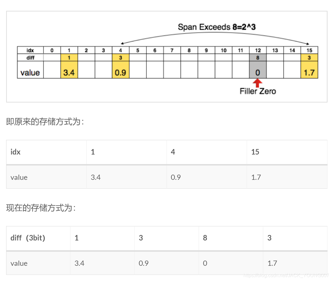 相对位置的参数:在压缩完参数之后,我们存了权值和权值对应的参数。之前的参数存的是绝对的参数,我们现在存相对的参数,就是两个参数的差值,比如我们用三个特存相对的参数,只要两个元素的距离小于8,都能把参数存为3个比特的,如果两个参数的距离大于这个值,我们就在第8个位置设置一个0值。