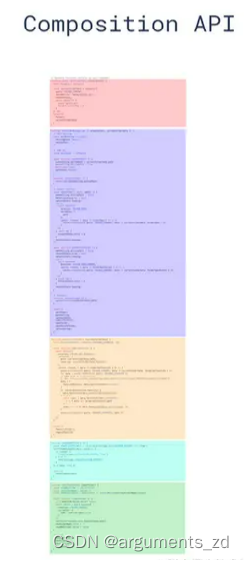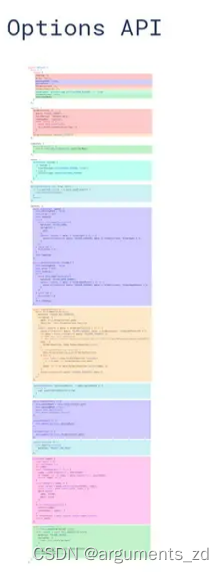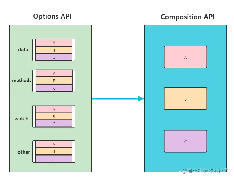 在一个组件仅承担单一逻辑的时候,使用 Options API 来书写组件是很清晰的。 但是在我们实际的业务场景中,一个父组件总是要包含多个子组件,父组件需要给子组件传值、处理子组件事件、直接操作子组件以及处理各种各样的调接口的逻辑,这时候我们的父组件的逻辑就会变得复杂。 我们从代码维护者的角度出发,假设这个时候有 10 个函数方法,自然我们要把他们放入到methods中,而这个 10 个函数方法又分别操作 10 个数据,这个 10 个数据又分别需要进行Watch操作。 这时候,我们根据Vue2的Options API的写法,就写完了 10 个method、10 个data、10 个watch,我们就将本来 10 个的函数方法,分割在 30 个不同的地方。