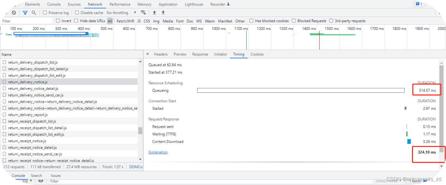 可以看出使用了324ms,其中Queueing(队列)排队了314.57ms。