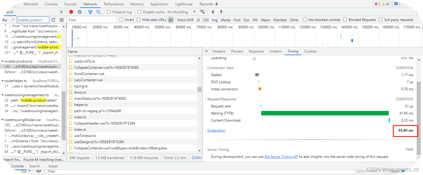 可以看到使用了44.8ms,最大的消耗是Waiting(等待打包)的时间41.95