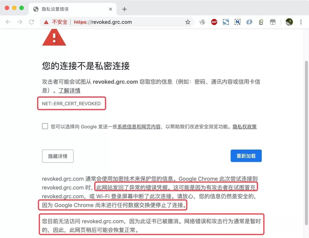 如果,证书在有效期之内需要丢了怎么办?需要吊销证书了,那么这里就多了一个证书吊销状态的检测。用户将需要吊销的证书通知到CA服务商,CA服务商通知浏览器该证书的撤销状态。来看一个证书吊销后的浏览器提醒: