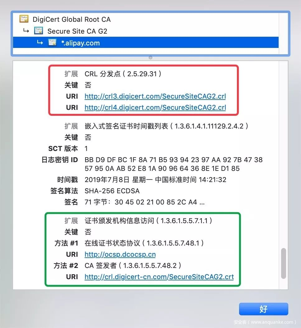 这种方法避免CRL更新延迟问题。同样的,X.509 v3证书的OCSP信息也是存储在拓展信息中,如alipay.com证书那张图的绿色框内部分。