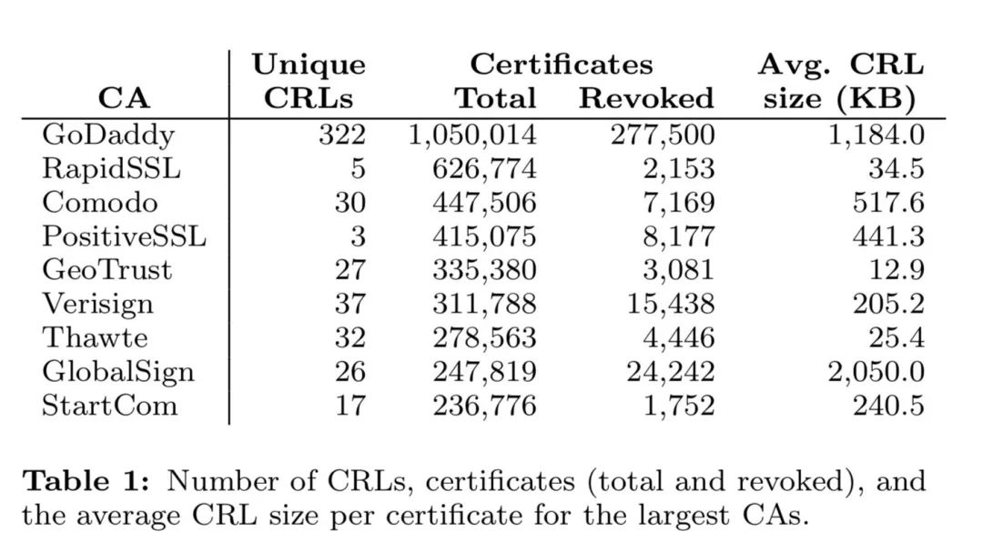 但这也不是完美解决了这个问题,来自【An Evaluation of the Effectiveness of Chrome’s CRLSets】: