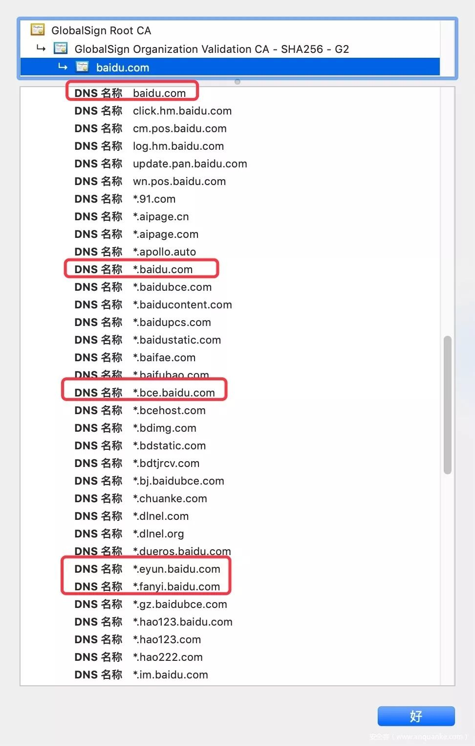 中间CA提供了对域名证书的管理以及颁发的颗粒度度控制。证书的生效范围会限于固定域名、域名范围(包括子域)或者固定IP。比如下图是https://www.baidu.com的HTTPS证书DNS信息。