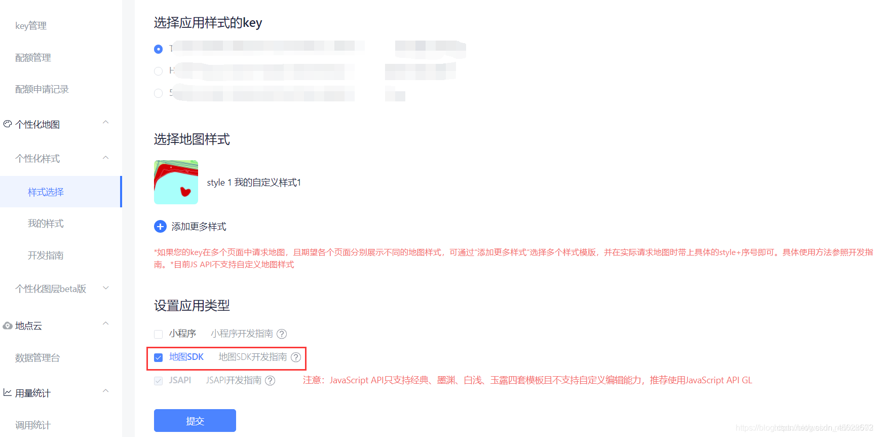 下面我们需要选择应用样式的key,还没有的话需要去key管理里创建一个,后面我们将用到。虽然本示例使用JSAPI GL进行演示,但还是必须在地图sdk和小程序中至少勾选一个,这里我们就选地图sdk吧。
