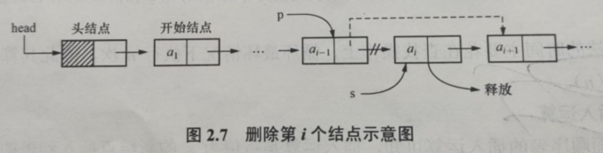 概述:先使p指向第i-1个结点,然后再使得p—>next指向第i+1个结点,再将第i个结点释放掉。