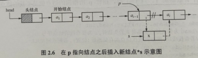 概述:先使p指向a(i-1)的位置,然后生成一个数据域值为x的新结点*s,再进行插入操作。