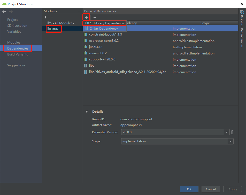 2. 选择 Depandencies > app > 点击 “+”,选择第一个选项“Library Dependencies”