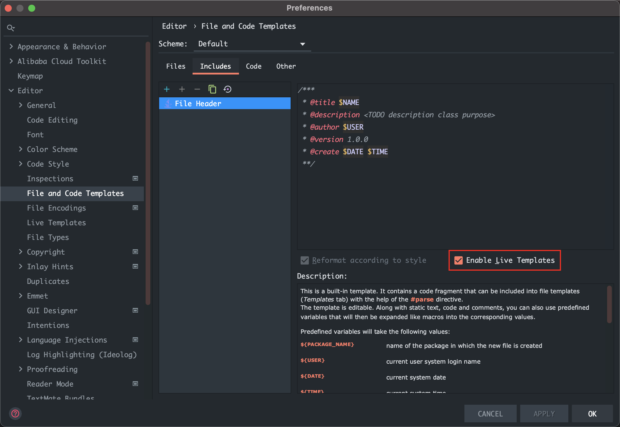 设置好注释模板后记得启用Enable Live Templates,这样在创建新的file时才会自动生成你设置的模板注释。效果如下: