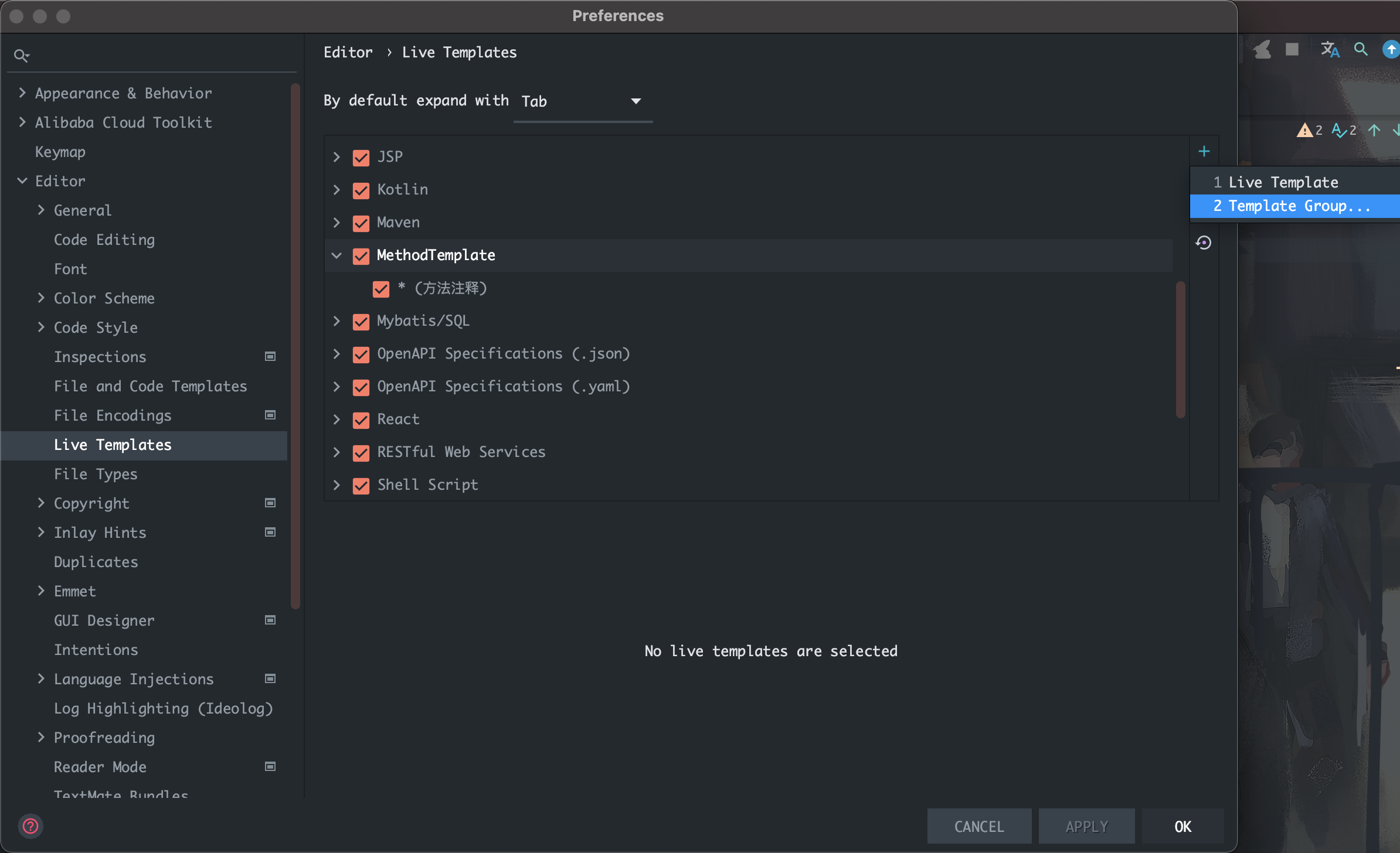 在Preference界面下,在左侧导航栏中找到Live Templates,点击右侧的加号,先添加一个Template Group,然后取一个名字,我设置的名字如图所示:MethodTemplate。