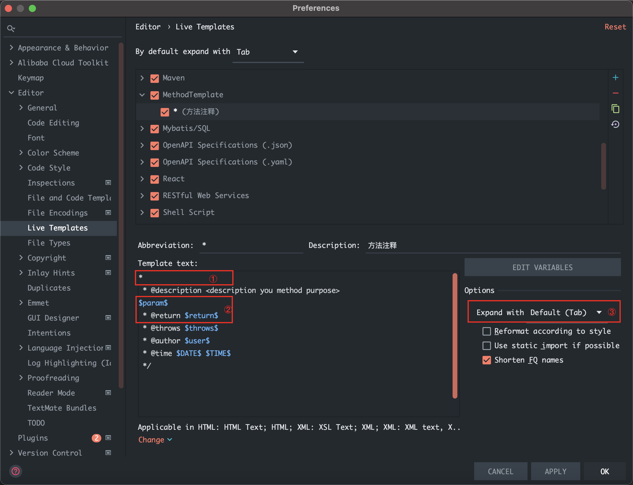 Abbreviation是设置的快捷方式的缩写,用于在你给方法添加注释时的提示标志。我为了简单我直接设置的*号。