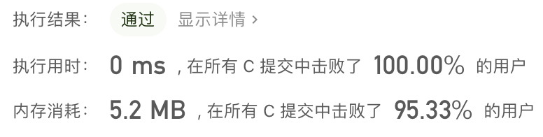 在写完 lengthOfLastWord 函数体后,点击右下角的 “执行代码”,然后观察 “输出” 和 “预期结果” 是否一致,一致的话就点击 “提交” 按钮。点击 “提交” 按钮后,系统会使用更多的测试用例来测试我们写的函数体,如果所有的测试用例都通过了,那么就会给出 “通过” 的字样,如果没有通过,会给出失败的那一组测试用例,我们继续修改代码。我们以上代码 “提交” 以后的截图如下: