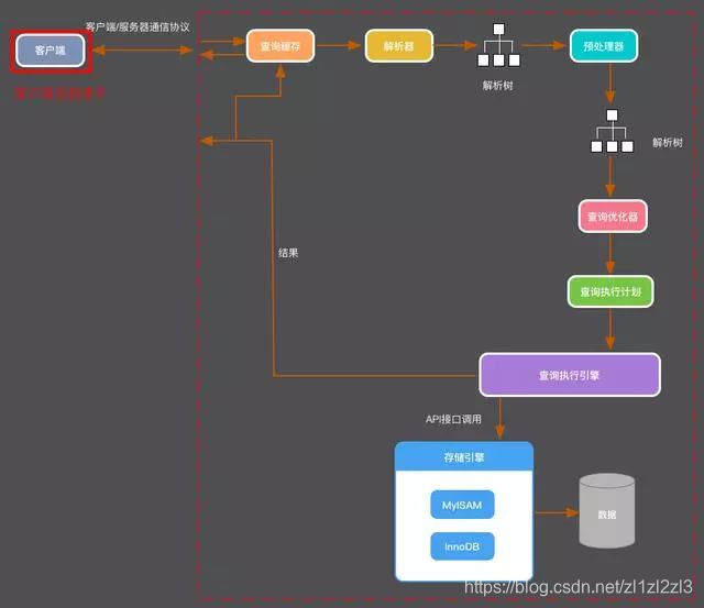 1.当我们请求mysql服务器的时候,MySQL前端会有一个监听,请求到了之后,服务器得到相关的SQL语句,执行之前(虚线部分为执行),还会做权限的判断