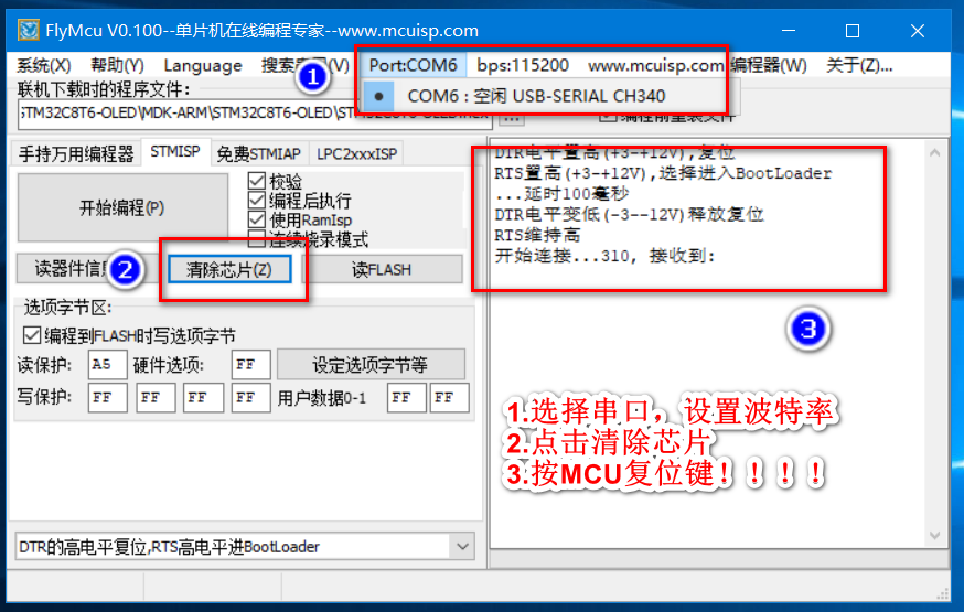 1. 设置MCU为ISP模式:具体做法就是BOOT0 = 1 , BOOT1 = 0,将BOOT0接3.3V,BOOT1接GND,重新上电后MCU会默认进入ISP模式