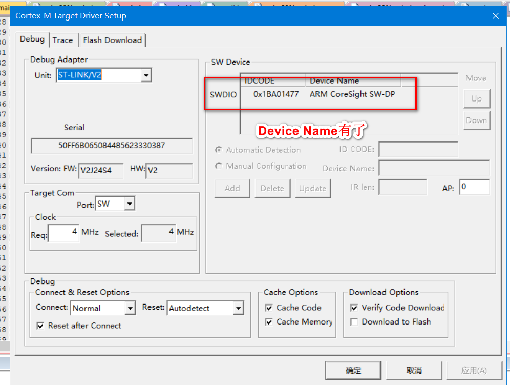 debug --> settings 打开的时候明明可以看到ST-Link的设备信息,可是就是SWDIO报错连不上,No target connected;