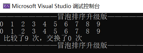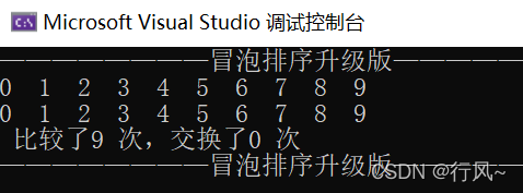虽然目前的比较次数和普通的冒泡是一样的。这是因为这组数据是到最后一趟才变成有序的,要是我一开始就用一个有序的数据去排序呢,那么它是不是只要比较一趟就行,我们看结果。