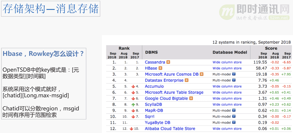 我们首先一查发现有一个时序型的数据库是一个OpenTSDB,他的应用场景跟这个业务很相似。OpenTSDB它内部是用Hbase来实现的,我们觉得Hbase就很好。我们为什么选择Hbase?因为有团队维护,非常现实。选用了Hbase之后,这个接下来如果用过Hbase的同学就知道,除了我们要分片,这些做好了之后,最关键的是要设计Rowkey设计是需要结合业务,而且需要设计得非常精妙,我们的Rowkey结果就是一个会话chatid ID,Chatid可以分散region,msgid 时间有序用于范围检索。
