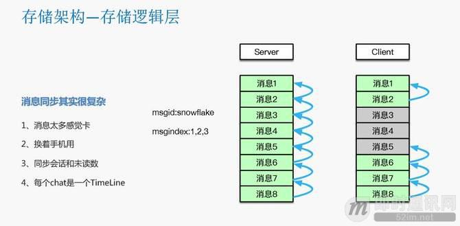 第一个就是刚才提到的减少存储量。这个是下面的存储库,比如有很多群,可能有2000多人有,如果我发一条消息就存2000份,那简直是灾难,所以说我们只能存一份,因此我们看这个图就是左边的蓝色之后,我们只存了一份,标明了这个消息ID,标明了这是哪个会话或者是哪个群的。