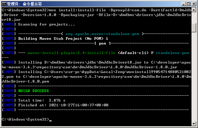 mvn install:install-file -DgroupId=com.dm -DartifactId=DmJdbcDriver -Dversion=1.8.0 -Dpackaging=jar -Dfile=D:\dmdbms\drivers\jdbc\DmJdbcDriver18.jar执行示意图如下: