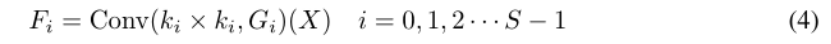 以多分支的方式提取输入特征图的空间信息,每个分支的输入通道维度为C,获得更丰富的输入张量位置信息,并对其进行多尺度并行处理。在金字塔结构中使用多尺度卷积核可以生成不同的空间分辨率和深度。最后具有不同比例尺Fi的每个特征图具有公共通道维数C'=C/S。对于每个分支,它独立地学习多尺度空间信息,并以局部方式建立跨通道交互。为了降低数据量,引入组卷积。多尺度内核大小第i个内核大小ki=2×(i+1)1和组大小之间的关系可以写成![]()