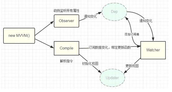 - 作为数据绑定的入口,整合Observer、Compile和Watcher三者,通过Observer来监听自己的model数据变化,通过Compile来解析编译模板指令,最终利用Watcher搭起Observer和Compile之间的通信桥梁,达到数据变化->视图更新;视图交互变化(input) ->数据model变更的双向绑定效果。