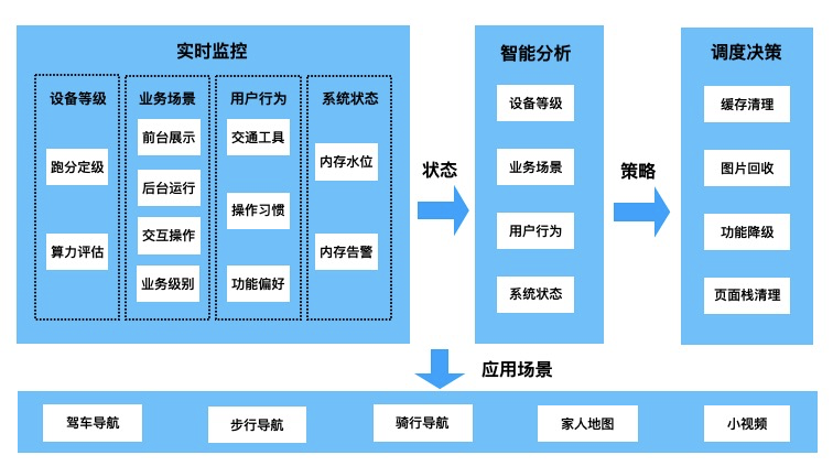 随着业务的增长给高德地图这个超级APP带来了极大资源压力,因此我们沉淀了一套自适应资源管理框架,来满足不同业务场景在有限资源下能够做到功能和体验极致均衡。主要的设计思路是通过监测用户设备等级、系统状态、当前业务场景以及用户行为,利用调度算法进行实时推算,统一管理协调APP当前资源状态分配,对用户当前不可见的内存等资源进行回收。