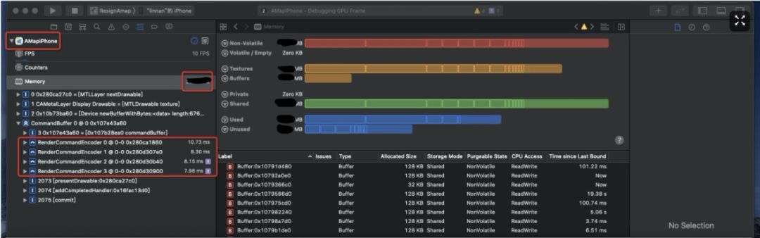 Xcode自带Debug工具Capture GPU Frame,可以分析出具体显存占用,显存主要分为纹理Texture部分和Buffer部分,通过详细的地址信息分析具体消耗。Android端类似分析显存工具可以用Google的Graphics API Debugger。