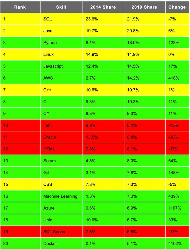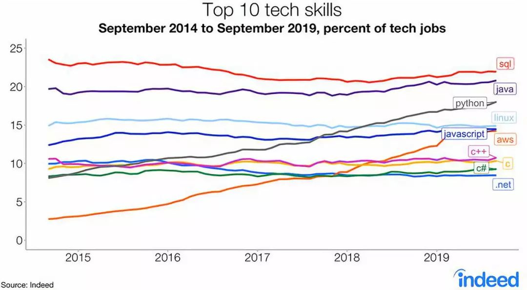 虽然这一次 Python 和 AWS 仅仅排在第三名和第六名,但重点在于,这二位的热度在过去的五年中分别上涨了 123% 和 418%。相比之下,排在第二名的 Java 上升缓慢,而还在榜首的 SQL 甚至出现了下跌趋势。