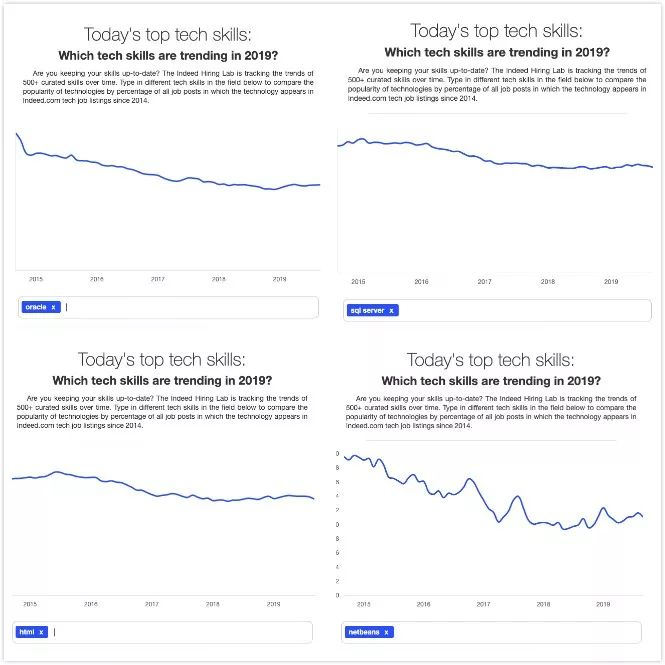 表格中的红色区域是热度下降较为明显(超过 10%)的几项技能,包括Oracle(-38%)、HTML(-17%)、SQL Server(-17%)、.net(-15%)。从下面的曲线图中可以更加直观地看到这种趋势。