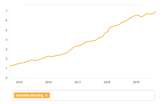 同样表现亮眼的还有机器学习,热度从 2014 年的 1.3% 上升到 7.0%,增幅达 493%。