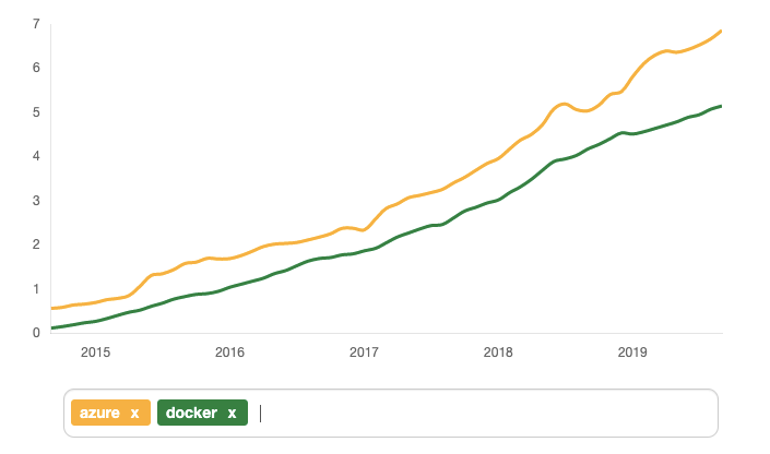 然而,这五年间起伏最大的黑马并不是这两位,而是目前暂居第 17 位的 Azure 和第 20 位的 Docker,二者的热度分别上涨了 1107% 和 4162%。在 2014 年的时候,Azure 的热度不过才 0.6%,而 Docker 的热度甚至只有 0.1%,说是一种阶层跃升也不为过。
