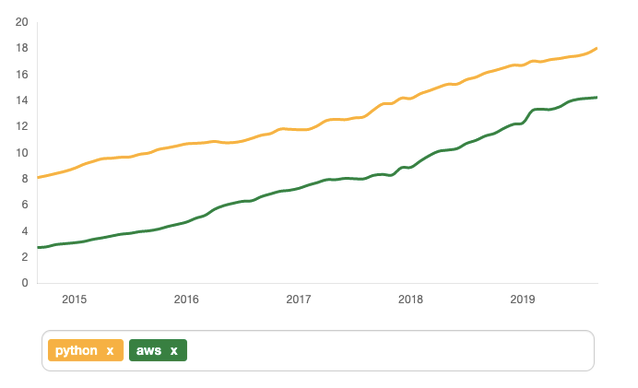按目前的趋势发展下去,Python 和 AWS 很有可能在未来的一到两年内跻身榜首。