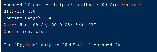 curl -i http://localhost:9090/interservercurl是一个命令行工具,通过指定的URL来上传或下载数据,并将数据展示出来。这里我利用工具模拟了我这边的长连接建立url,去测试我的服务器长连接是否正常。