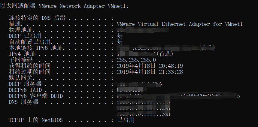 显示已配置且所要使用的附加信息(比如IP地址),并且会显示置于本地网卡中的物理地址(MAC);如果IP地址是从DHCP服务器租用的,会显示DHCP服务器IP地址和租用地址预计失效日期。