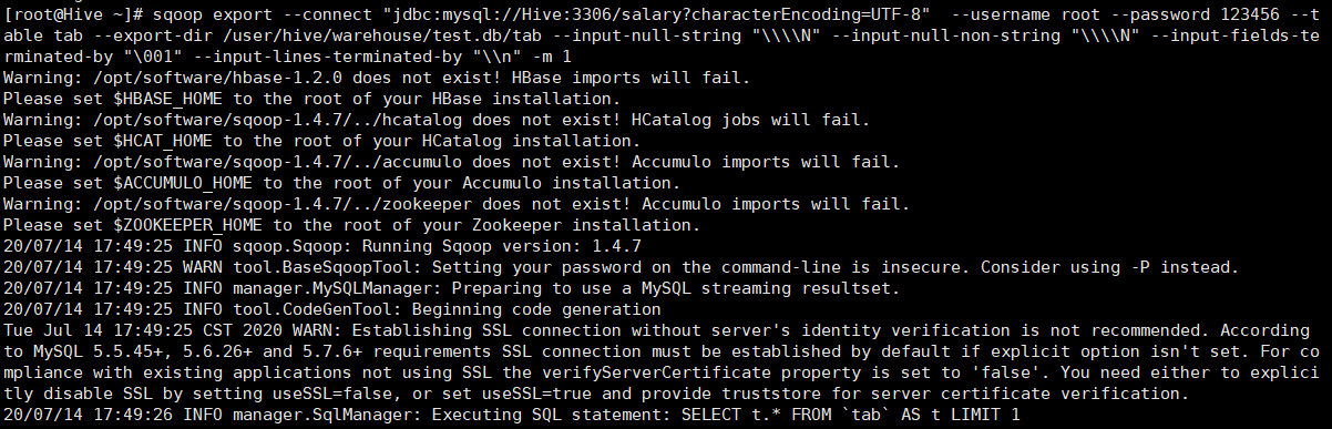 sqoop export --connect "jdbc:mysql://Hive:3306/salary?characterEncoding=UTF-8" --username root --password 123456 --table salary1 --export-dir /user/hive/warehouse/test.db/salary1 --input-null-string "\\\\N" --input-null-non-string "\\\\N" --input-fields-terminated-by "," --input-lines-terminated-by "\\n" -m