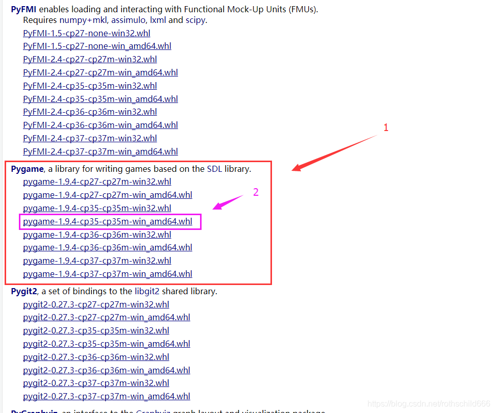这里我们需要选择python版本以及电脑位数所对应的.whl文件,刚才第一步可知我电脑下载的是3.5.2版本的Python,这里对应的pygame应该是cp35表示3.5版本,我的电脑是64位,这里对应的pygame应该是amd64对应电脑64位,所以我选择了“pygame-1.9.4-cp35-cp35m-win_amd64.whl”(见紫色箭头指向的紫色框)。