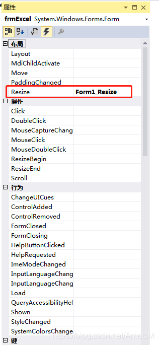 2. 其中 Form1_Resize 方法需要自己在窗体“属性”里手动设置Resize方法(找到下图中Resize,双击后面空白处就可);