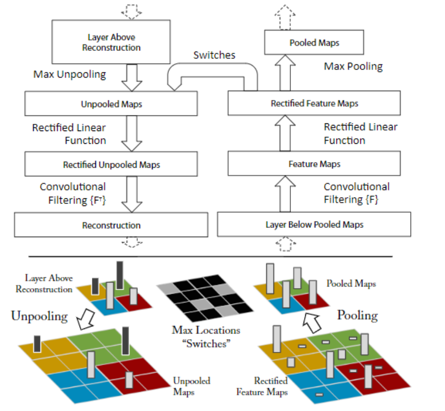 - Unpooling:在前向传播时,记录相应max pooling层每个最大值来自的位置,在unpooling时,根据来自上层的map直接填在相应位置上,如上图所示,Max Locations “Switches”是一个与pooling层输入等大小的二值map,标记了每个局部极值的位置。